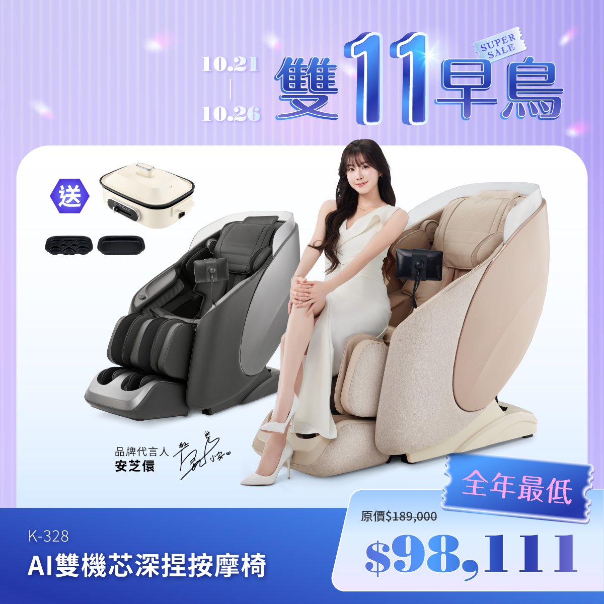 K-328-SP(雙11早鳥預購)AI 雙機芯深捏按摩椅原價189,000特惠價98,111